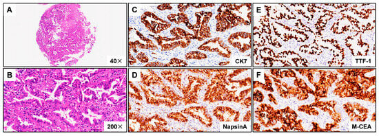 FFPE tissue sections were stained with anti-CK7, anti-NapsinA, anti-TTF-1, anti-M-CEA, and anti-pan-TRK antibodies. Detection was performed in a Ventana Benchmark Autostainer (Roche, Basel, Switzerland).