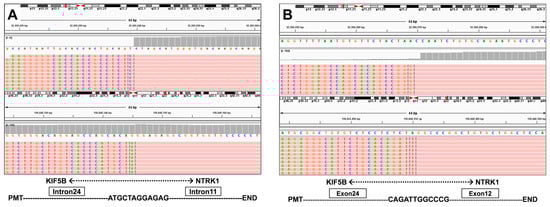 (A) Discovery of the KIF5B-NTRK1 fusions by DNA-based NGS testing. The breakpoints on KIF5B and NTRK1 are located on chr10:32305041 and chr1:156845146. (B) Identification of the KIF5B-NTRK1 fusions at the RNA level.