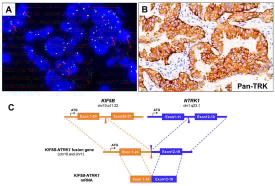 A 66-year-old male Chinese patient, who had been smoking for more than 40 years, complained of coughing and chest pain. In October 2022, he was admitted to a local hospital. The patient had no history of coronary heart disease, hypertension, tuberculosis, diabetes, or any other infectious diseases. He had previously undergone a thyroidectomy for goiter in 2007, and his thyroid function remained normal after the operation. Following a physical examination and a series of auxiliary examinations, a computed tomography (CT) scan revealed a mass measuring 49 × 30 mm in the patient’s left upper lung (Figure 1). Additionally, multiple metastatic lesions were discovered in the brain and bones. A fiberoptic bronchoscope-guided biopsy of the lung tumor indicated adenocarcinoma (Figure 2), and he was diagnosed with stage IVB non-small-cell lung cancer (T2bN2M1c). To discover potential therapeutic regimens, an NGS-based profiling of 1267 genes was performed using biopsy tissues. A rare but novel KIF5B-NTRK1 rearrangement was discovered with an allele frequency of 10.25%, and it was identified at the RNA level (Figure 3A,B). The breakpoints on genes KIF5B and NTRK1 were located on chr10:32305041 and chr1:156845146, respectively. The result was confirmed by FISH and IHC approaches (Figure 4A,B). The chimeric gene contained exons 1–24 of KIF5B and exons 12–19 of NTRK1 genetic loci (Figure 4C). In addition, other co-mutations, including frameshift mutation in phosphatase and tensin homolog (PTEN) and copy number amplification of the genes FGF4 and MDM2, were also detected in this patient. No EGFR mutations or anaplastic lymphoma kinase (ALK) gene rearrangements were found. Thus, the patient received entrectinib (600 mg. PO. QD) as the first-line treatment in December 2022. The patient’s clinical symptoms improved dramatically after 3 months, and the shrinkage of primary lesions was significant (Figure 1). The first efficacy evaluation of the drug was determined by the partial response (PR), according to the Response Evaluation Criteria In Solid Tumors (RECIST), edition 1.1. So far, the patient has shown 12 months of progression-free survival (PFS), without any serious adverse events.