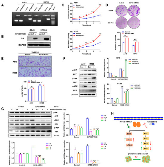 KIF5B-NTRK1 overexpression significantly increased the proliferation and adhesion-dependent colony formation by activating MAPK and PI3K-AKT signaling pathways. (A) PCR was used to verify the expression of KIF5B-NTRK1 arrangement in A549 and H1755 cells. (B) Western blotting was used to verify the expression of KIF5B-NTRK1 arrangement in A549 and H1755 cells. (C) The effect of KIF5B-NTRK1 on the proliferation of A549 and H1755 cells was analyzed by CCK-8 assay. (D) The effect of KIF5B-NTRK1 on the proliferation of A549 and H1755 cells was analyzed by adhesion-dependent colony formation assay. (E) The effect of KIF5B-NTRK1 on the invasion ability of A549 and H1755 cells was evaluated by transwell assay. (F) Western blotting was used to verify the effect of KIF5B-NTRK1 on the key components of MAPK and PI3K-AKT signaling pathways in A549 and H1755 cells. β-actin was used as a loading control. Image J software was used to quantify the key proteins by grayscale value. (G) H1755 cells were treated with entrectinib (500 nM) at different times, and the expression levels of p-AKT, p-ERK, and p-MEK were quantified using WB analysis. The grayscale values of the protein bands were measured using ImageJ software. (H) Schematic illustration showing KIF5B-NTRK1 exerting oncogenic properties by activating MAPK and PI3K/AKT signaling pathways. ** p < 0.01, *** p < 0.001, and **** p < 0.0001, versus indicated group. ns, not significant, p ≥ 0.05; All data are presented as the means ± SEM.