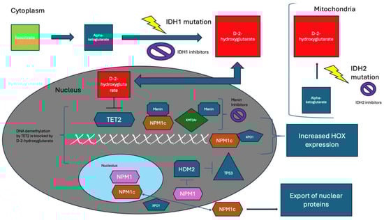 Effects of critical mutations on cellular function and pathophysiology of AML. In the cytoplasm, isocitrate is converted to alpha-ketoglutarate (A-KG). However, IDH1 mutations reduce A-KG to D-2-hydroxyglutarate (D-2-HG), an oncometabolite. D-2-HG then travels to the nucleus and inhibits TET2, blocking DNA demethylation. Additionally, D-2-HG is created via reduction in the mitochondria by mutant IDH2 enzymes from Krebs cycle-generated A-KG. IDH1 inhibitors target the cytoplasmic reduction of A-KG to D-2-HG, while IDH2 inhibitors target the same process in the mitochondria. NPM1, which generally resides in the nucleolus and minimally binds XPO1, can travel to the nucleoplasm in stress conditions. In the nucleoplasm, it inhibits HDM2, which is significant because HDM2’s normal function is to inhibit TP53. Thus, by inhibiting HDM2, NPM1 can increase TP53, which has important implications for cell regulation in stressful conditions. Mutant NPM1 (NPM1c) has a higher affinity to XPO1 and is prone to nuclear export, leading to critical protein export from the nucleus. Additionally, the consequent result of mutant NPM1 and XPO1-NPM1c can increase HOX expression. Furthermore, NPM1c and KMT2Ar interact with menin, facilitating leukemogenic cellular changes, which can be targeted via menin inhibition. Reprinted from Figure 1 in Ref. [3].