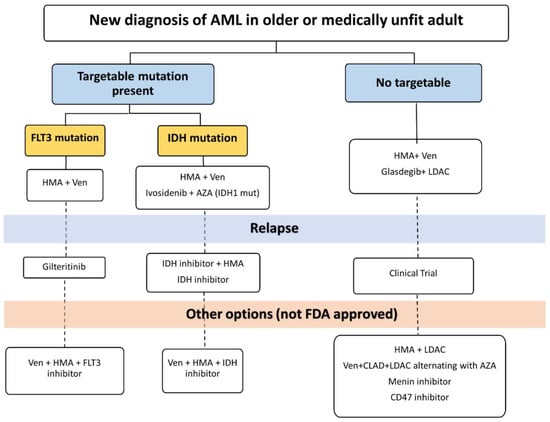 - Premnath, N.; Madanat, Y.F. Paradigm Shift in the Management of Acute Myeloid Leukemia—Approved Options in 2023. Cancers 2023, 15, 3002. [Google Scholar] [CrossRef]
