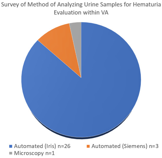 The preparation of samples is another known challenge in the workup of AMH. While the AUA guidelines recommend a manual count, the automation of urine sediment examination may decrease inter-individual variation and reduce laboratory workloads [20]. A survey of VA pathologists found that of the 30 VA facilities polled across the country, 29 used automated cell counters to perform microscopic analyses (Figure 1). There is an opportunity for standardization within the VHAS that is veteran-centric and cost-effective.