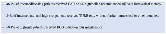 Adjuvant intravesical immunotherapy with bacillus Camette–Guerin (BCG) has been a standard treatment for high-grade and carcinoma in situ (CIS) NMIBC (intermediate- and high-risk patients) for over 30 years, with confirmed efficacy [32,34]. Despite this, 40–45% of patients are found to have residual or recurrent tumor after initial BCG therapy, 20% of which are unresponsive [35].
