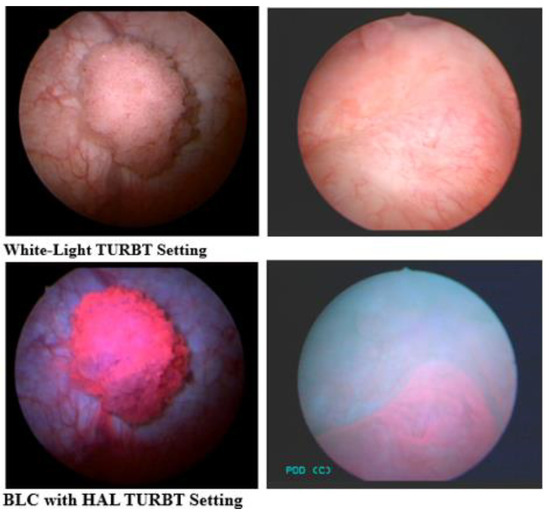 The basis for BLC’s FDA approval was a study by Stenzl et al., which demonstrated that 16% of patients had additional Ta or T1 bladder tumors detected with BLC [46]. Additional tumors were high-grade in 43% of these patients. There was no significant difference between BLC and WLC in terms of false positive results [46]. Hermann et al. demonstrated that BLC with HAL could find residual lesions following an initial WL TURBT in up to 49% of patients [47].