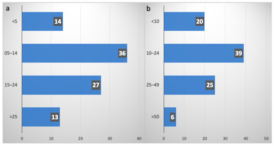 (a) Numbers of newly diagnosed SCLC patients per year; (b) mewly diagnosed ES-SCLC patients per year (b). On the vertical axes, the number of new diagnoses collected for subgroups in increasing order; on the horizontal axes, the absolute numbers of new diagnoses in ascending order.
