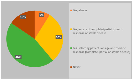 The respondents in favor of PCI prefer to perform it before the first cycle of maintenance immunotherapy (37%) or even in association with it (39%); only 24% prefer to discontinue immunotherapy during PCI. Forty-seven percent of radiation oncologists use a 3D technique, 17% use IMRT, and 37% are in favor of hippocampal-sparing brain RT as it demonstrates a significant reduction in the risk of neurocognitive impairments [25]. Unfortunately, the role of PCI in ES-SCLC is still unclear, and the results of ongoing trials such as the MAVERIK and PRIMAlung studies are still awaited in order to find an answer to this important issue [26,27].