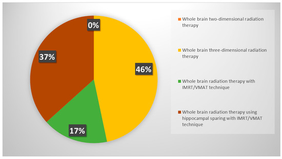 Although the new scenario related to the wide adoption of immunotherapy in ES-SCLC, almost all radiation oncologists (85%) usually recommend PCI (Figure 2); respondents were keener to perform PCI in patients selected on age and thoracic response (complete, partial or stable disease) (46%), while 30% of respondents declared considering only thoracic response. PCI was never offered in an ES-SCLC setting by 15% of clinicians. If prescribed, PCI is mostly performed after the end of chemo-immunotherapy, before starting the first cycle of maintenance immunotherapy (37%) or in concomitance with it (22%); several respondents declared waiting until the completion of the first cycle of immunotherapy, both discontinuing immunotherapy during PCI (24%) and not (17%). Whole brain three-dimensional conformal radiation therapy (3DCRT) was used in the case of PCI by 46% of respondents, while intensity-modulated RT (IMRT)/volumetric modulated arc therapy (VMAT) with or without hippocampal avoidance was chosen by 37% and 17% of responders, respectively (Figure 3).