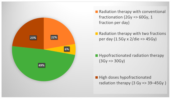 Before the CASPIAN and IMpower 133 publications, ctRT for ES-SCLC, achieving a clinical and radiological response to chemotherapy, was part of the management of these patients, and it is still suggested by American and European guidelines [28,29]. The RTOG 0937 trial randomized patients with ES-SCLC with any response to chemotherapy to receive PCI vs. PCI plus cRT (45 Gy in 15 fractions). The study did not meet the primary endpoint (1-year OS), even if it was able to delay thoracic progression in the RT group [30]. The phase III CREST trial randomized ES-SCLC with any response to 4–6 cycles of chemotherapy into a ctRT group (30 Gy in 10 fractions) compared to the observation one. The results showed a 2-year OS in favor of ctRT, 13% vs. 3% (p = 0.004), and also the PFS was improved in the ctRT group HR: 0.73 (95% CI 0.61–0.87; p = 0.001) without determining an excess of toxicities [31]. More recently, the Italian TRENDS trial confirmed that ctRT reduces the risk of intrathoracic progression, being also well tolerated [32]. Even the role of ctRT is still debated, as clearly, no data can be drawn from the two immunotherapy trials where ctRT was not allowed. As a matter of fact, thoracic ctRT after any response to chemo-immunotherapy is not recommended in the American and European guidelines [1,29]. However, retrospective data, including patients with ES-SCLC treated with immunotherapy combined with chemotherapy with/without ctRT, demonstrated that the addition of thoracic ctRT improved PFS and local control, even if it did not improve OS [33]. On the other hand, the TREASURE study, recently presented at ESMO 2023, showed that the addition of thoracic ctRT after first-line chemo-immunotherapy can be associated with an increased rate of severe toxicities, (especially pneumonitis, sepsis and multiorgan failure), so that the recruitment was permanently discontinued [34]. The results of our survey showed that the majority of respondents (83%) propose ctRT when patients present an intra- and extrathoracic response to systemic chemo-immunotherapy. The most used schedule is 30 Gy in 10 fractions (49%), followed by the use of higher doses such as 39–45 Gy in 13–15 fractions (23%) or 60 Gy in 30 fractions (22%). Only 6% of radiation oncologists use the twice-daily regimen (45 Gy in 30 fractions BID) in this setting. The use of modern radiotherapy techniques is preferable in order to achieve a reduction in treatment-related toxicity and improve treatment tolerance. Half of respondents perform ctRT in association with immunotherapy, 36% before starting immunotherapy, and only 14% suspend immunotherapy during thoracic cRT.