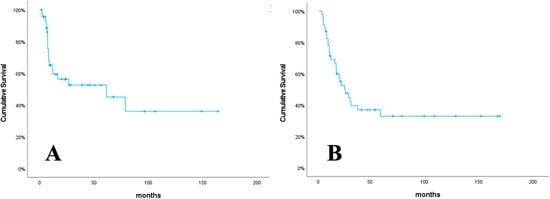 The median follow-up time for this study was 19.5 months (range: 2.6–166.3 months). The one-year PFS and OS rates were 62.2%, and 69.0%, respectively (Figure 1). Progression occurred in 20 patients (43.5%). Of the 20 patients with progression, 15 had local recurrence (LR), 8 had distant metastasis (DM), and 3 had both LR and DM. At the last visit, 18 patients (39.1%) were alive, and 28 patients (60.9%) had died.