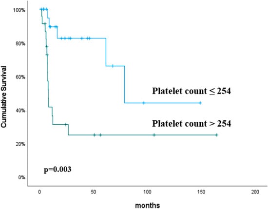 The univariate analysis found the platelet (p = 0.003) and monocyte (p = 0.04) counts to be significant predictive factors for PFS. In the multivariate analysis, the platelet count (p = 0.005) was the only independent predictor of PFS. The PFS rates were higher in the platelet count ≤254 group than in the platelet count >254 group (p = 0.003) (Table 3). The predictive value of the platelet count for PFS is shown in Figure 2.