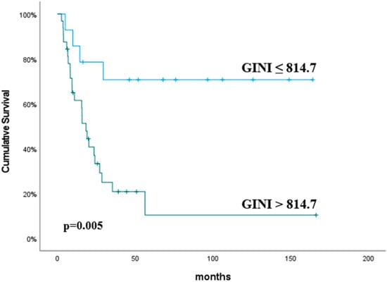 The median OS duration was 24.1 months (95% CI, 11.9–36.2). The univariate analysis revealed that the neutrophil count (p = 0.04), lymphocyte count (p = 0.01), NLR (p = 0.005), PLR (p = 0.004), CRP (p = 0.02), ALBI grade (p = 0.01) and GINI (p = 0.005) were significant predictive factors for OS (Table 4). In addition, the multivariate analysis determined the GINI to be predictive of improved OS, and this was close to being statistically significant (p = 0.08). The OS was significantly higher in the GINI ≤ 814.7 group than the GINI > 814.7 group (p = 0.005). The median OS for patients with ALBI grade 2 was 10.2 months, compared to 22.15 months for those with ALBI grade 1 (p = 0.01). No cases were observed to be ALBI grade 3. The predictive values of the GINI and ALBI grades for OS are shown in Figure 3 and Figure 4, respectively.