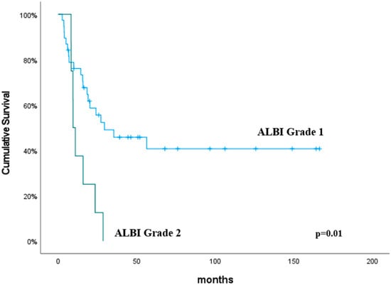 The albumin–bilirubin (ALBI) grade is a novel index developed to assess the liver function and predict the prognosis in patients with hepatocellular carcinoma (HCC), independent of the degree of underlying liver fibrosis. The prognostic significance of the ALBI grade has been extensively documented across various treatment modalities for HCC, including hepatic resection, systemic therapies, locoregional ablative therapies, and transarterial treatments [4]. Furthermore, the ALBI grade has demonstrated prognostic utility in a range of other malignancies, including pancreatic, colorectal, and gastric cancers, as well as intrahepatic cholangiocarcinoma, extrahepatic bile duct cancer, and certain brain tumors, such as gliomas and medulloblastomas [5,6,7,8,9,10].