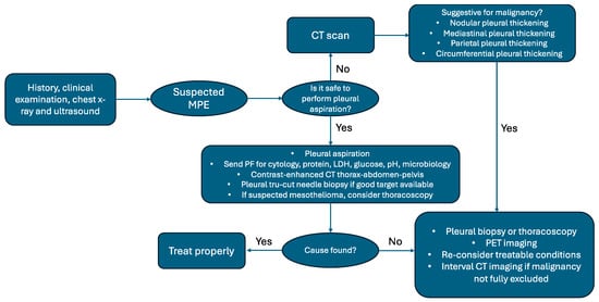 When MPE is suspected, thorough physical examination and clinical assessment are crucial in guiding the subsequent diagnostic pathway. Imaging is essential in diagnosing pleural effusion, assessing its extent, identifying underlying malignancies, and guiding or planning invasive procedures. In this scenario, the chest X-Ray remains a valuable and quickly accessible diagnostic tool. Nevertheless, no single test is definitive on its own. In recent years, there have been notable advancements in the diagnosis of pleural diseases, particularly with the introduction of thoracic ultrasound [], which has become a key component in evaluating pleural conditions, including MPE. Given that initial pleural fluid aspiration often has low sensitivity in diagnosing MPE, a biopsy for histological examination of pleural tissue is typically needed to confirm the diagnosis and guide cancer treatment. However, there are instances where pleural fluid alone suffices for diagnosis and molecular testing of malignancy, occurring in about 30% of cases [] (Figure 1).