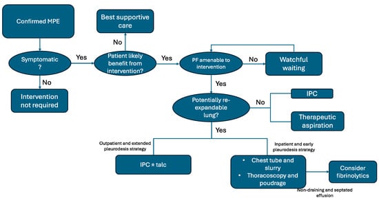 The primary goal of MPE treatment is symptom relief []. Several techniques can be applied to treat symptomatic MPE: repeated therapeutic thoracentesis, thoracic drainage, IPC, talc, or surgery. Over the past decade, several randomized controlled trials have been conducted to explore various aspects of MPE management, including the optimal drain size, different methods for administering talc, the best techniques for achieving pleurodesis, and IPC drainage. Treatment choices should be individualized based on clinical factors and patient preferences. Tools such as the PROMISE and LENT scores [,], can help guide treatment decisions. Evaluating whether the lung can fully re-expand and ruling out a ‘trapped lung’ are crucial first steps in determining the appropriate treatment strategy (Figure 2).