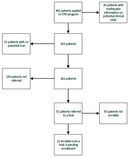 In the literature, a lack of available clinical trials is commonly reported, with 33–60% of people with cancer being unable to enroll in a clinical trial due to a lack of trial availability [4,21,35,36,40]. This was not reflected in the CTN program, where we identified a potential clinical trial for 88% of applicants. Most of the current literature speaks to the lack of clinical trials at the patient’s cancer treatment site. The CTN program searches outside of the patient treatment site and is able to identify potential clinical trials for most patients, underlining the need for this type of service for patients. Challenges remain with subsequent referrals and enrollments.