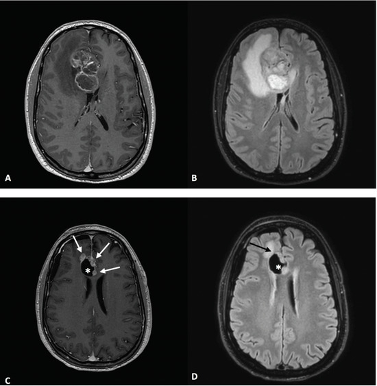 - Kumar, A.J.; Leeds, N.E.; Fuller, G.N.; Van Tassel, P.; Maor, M.H.; Sawaya, R.E.; Levin, V.A. Malignant Gliomas: MR Imaging Spectrum of Radiation Therapy- and Chemotherapy-Induced Necrosis of the Brain After Treatment. Radiology 2000, 217, 377–384. [Google Scholar] [CrossRef] [PubMed]