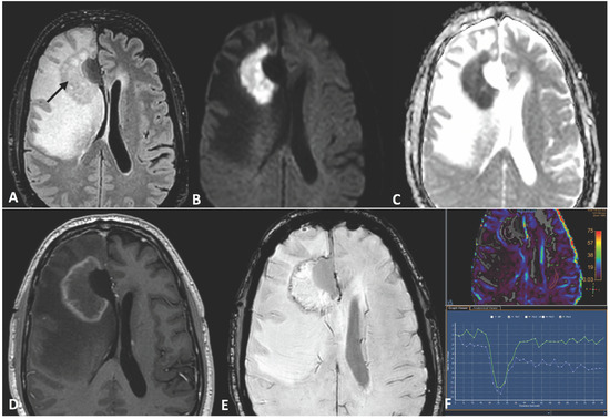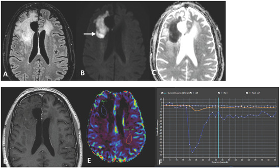 - Hein, P.A.; Eskey, C.J.; Dunn, J.F.; Hug, E.B. Diffusion-Weighted Imaging in the Follow-Up of Treated High-Grade Gliomas: Tumor Recurrence Versus Radiation Injury. AJNR Am. J. Neuroradiol. 2004, 25, 201–209. [Google Scholar]