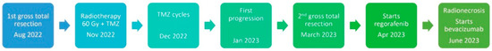 - Gatto, L.; Franceschi, E.; Tosoni, A.; Di Nunno, V.; Maggio, I.; Tonon, C.; Lodi, R.; Agati, R.; Bartolini, S.; Brandes, A.A. Distinct MRI Pattern of “Pseudoresponse” in Recurrent Glioblastoma Multiforme Treated with Regorafenib: Case Report and Literature Review. Clin. Case Rep. 2021, 9, e04604. [Google Scholar] [CrossRef] [PubMed]