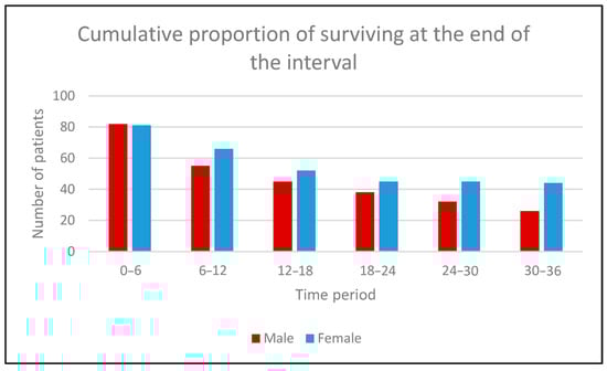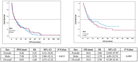 In Figure 2, the Kaplan–Meier survival curves illustrate the progression-free survival (PFS) and overall survival (OS) for both females and males. Notably, the median OS was 16.4 months, with females exhibiting 20.4 and males 14.3 months. The median PFS was 8.4 months for females and 7.5 months for males, yet the observed difference did not reach statistical significance.