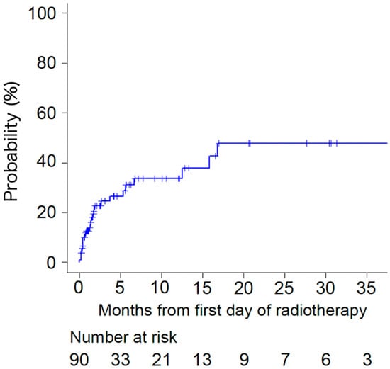Axial cortical involvement (≥30 or <30 mm) and BMA administration were assessed using the chi-square or Fisher’s exact test. Fracture incidence was analyzed using the Kaplan–Meier method. Time analysis was calculated from the first day of palliative RT. The patient’s death was considered the sensor. All statistical analyses were performed using R (The R Foundation for Statistical Computing, version 3.5.0, Vienna, Austria), which is designed to incorporate statistical functions frequently used in biostatistics.