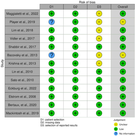 No specific risk-of-bias evaluation tools were identified for the needs of this systematic review. Thus, a modified tool was created that incorporates elements of two relevant tools: ROBINS-I (Risk Of Bias In Non-Randomized Studies-of Interventions) and QUADAS-2 (Quality Assessment of Diagnostic Accuracy Studies). This modified tool evaluated the three domains of patient selection, missing data, and selection of reported results. Domains such as confounding and measurement of outcomes were considered but deemed not applicable to the current systematic review. The results of our risk-of-bias assessment were visualized using the Risk-of-bias VISualization (robvis) web app [10].