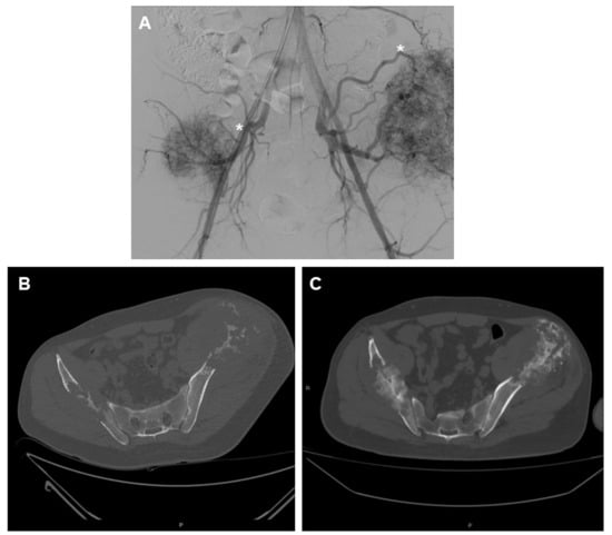 A 56-year-old male patient with two large metastases from renal cancer localized in both iliac bones. (A) panoramic DSA angiogram showing two large hypervascular masses supplied by hypertrophic vessels arising mainly from in internal iliac artery (asterisk). (B) Pre-embolization CT-scan demonstrating the two large lytic lesions of both iliac bones and (C) 6-month follow-up CT showing marked calcification of the lesions.