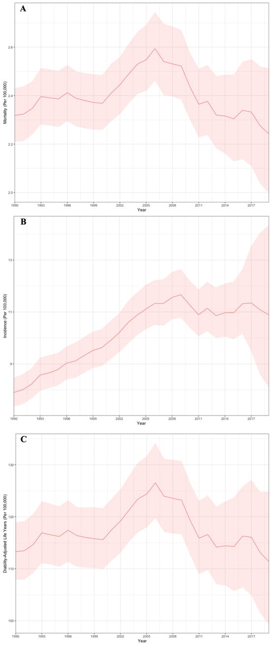 Mortality (A), incidence (B), and DALY rates (C) per 100,000 for EOCRC in Canada between 1990 and 2019.