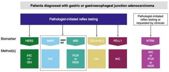 The expert working group further recommends that testing for HER2, MMR and/or MSI, PD-L1, and CLDN18 be carried out reflexively, initiated by the pathologist at the time of diagnosis (Figure 1). Although reflex testing has not been studied in the context of G/GEJ adenocarcinoma, evidence from other disease sites, particularly lung cancer, has demonstrated that reflex testing improves biomarker testing rates and time to treatment, and is cost-effective and efficient [36,37,38,39,40]. Therefore, it is anticipated that reflex testing of predictive biomarkers in patients with G/GEJ adenocarcinoma will support the timely initiation of targeted and immunotherapy treatments.