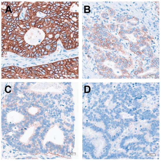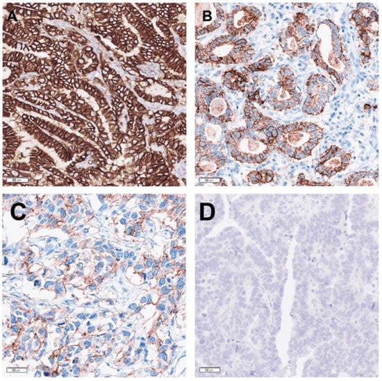 Currently, immunohistochemistry (IHC) is the predominant method used to test predictive biomarkers in G/GEJ adenocarcinoma due to the specific biomarkers being tested (Figure 1). Images of HER2, MMR, CLDN18, and PD-L1 IHC assays of representative cases are shown in Figure 2, Figure 3, Figure 4 and Figure 5, respectively. All biomarkers recommended by the expert working group for reflex testing in patients with G/GEJ adenocarcinoma—HER2, MMR, PD-L1, and CLDN18—can be evaluated using IHC [13,18,19,43]. Molecular methods are sometimes a feasible alternative, depending on the biomarker, or may be used as a confirmatory or secondary method following initial IHC testing. For example, IHC is recommended for initial assessment of HER2 overexpression, followed by fluorescent in situ hybridization (FISH) or other in situ hybridization (ISH) methods for specimens with equivocal results from IHC [41,47]. Although MMR deficiency is most often assessed with IHC, which is available in most laboratories, some laboratories may have polymerase chain reaction (PCR) or next-generation sequencing (NGS) tests for MSI, which is a reasonable alternative, as microsatellite instability results from MMR deficiency [67]. One study of a large number of GC specimens demonstrated over 98% concordance for results from MMR IHC and PCR-based MSI testing [68]. If NTRK testing is undertaken, there is some evidence that pan-TRK IHC can be an effective screening method in GC specimens, but fusions must be confirmed via molecular testing [69]. PCR or NGS may also be used to detect NTRK fusions [70]. The risk of tissue depletion should be considered when ordering molecular testing for NTRK fusions or MSI testing by PCR or NGS.