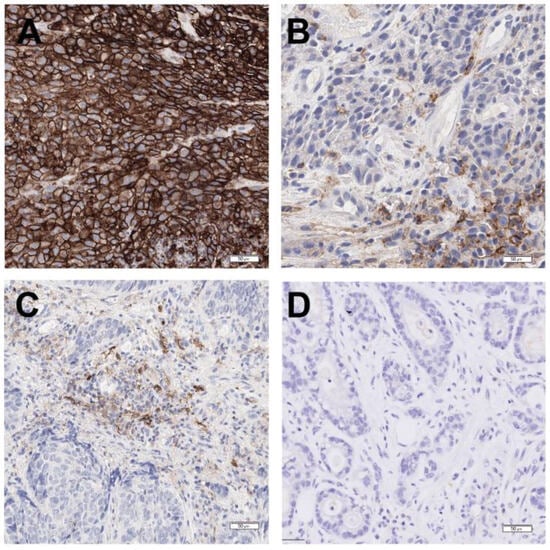 PD-L1 IHC (PD-L1 IHC 28-8 pharmDx from Agilent; performed on the Autostainer Link 48 according to the manufacturer’s protocol) scoring of representative gastric adenocarcinoma cases. Scoring is performed using the combined positive score (CPS), a ratio of PD-L1-staining cells (tumour cells, lymphocytes, and macrophages) relative to viable tumour cells. (A) High CPS showing high tumour cell staining (CPS on the whole slide was 100). (B) Low CPS with focal tumour and lymphocyte and macrophage staining (CPS on the whole slide was 5). (C) Low CPS with lymphocyte and macrophage staining but without tumour cell staining (CPS on the whole slide was <1). The positive lymphocytes were very focal compared to the tumour. (D) CPS of 0.