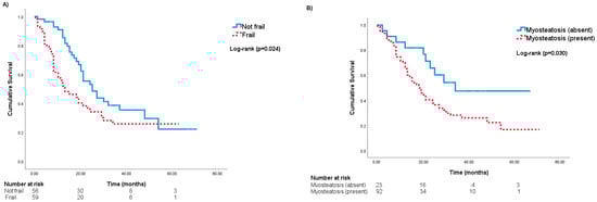 Probability of all-cause mortality based on (A) frailty and (B) myosteatosis.