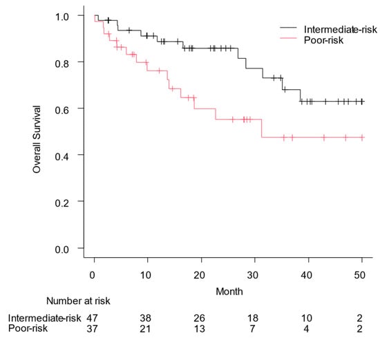 Overall survival (OS) from the date of the first administration of nivolumab plus ipilimumab to the date of all-cause mortality was assessed using the Kaplan–Meier curve. Median OS was not reached in patients with intermediate-risk renal cell carcinoma and 31.2 months in those with poor-risk renal cell carcinoma (p = 0.028).