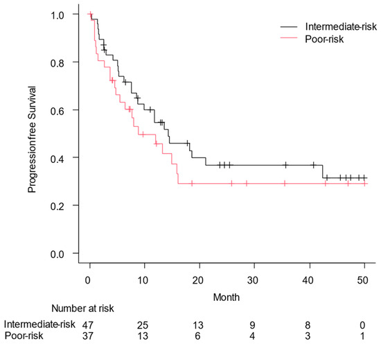 Progression-free survival (PFS) from the date of the first administration of nivolumab plus ipilimumab to the date of disease progression or all-cause death was assessed using the Kaplan–Meier curve. Median PFS was 14.3 months in patients with intermediate risk of renal cell carcinoma and 8.9 months in those with poor risk (p = 0.34).