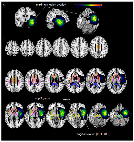 The maximum lesion overlay occurred with a 70% overlap among the group in the left insula, part of the superior/middle temporal gyrus, the amygdala, and the temporal pole (see Figure 2 and Table 2). At the subcortical level, the maximum lesion overlap occurred on part of the left sagittal stratum (IFOF + ILF) (with a 65% overlap across the patients).