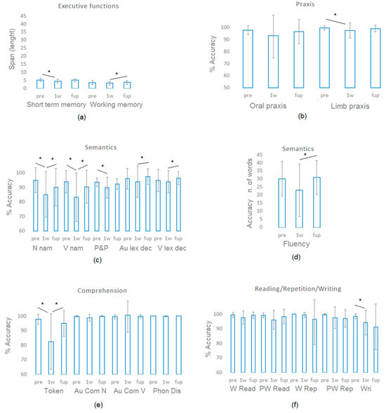 Patients’ performance before (pre), immediately post-surgery (1 week after, 1 w), and at follow-up (fup) assessment. (a) For executive functions the length of the short-term memory and working memory span is displayed; (b) Oral and limb (ideomotor apraxia), % of correct responses is shown; (c) % of correct responses in tests tapping semantics (N nam = noun naming; v nam = verb naming; P&P = Pyramids and Palm Trees Test; Au lex dec and V lex dec = auditory and visual lexical decisions); (d) for verbal fluency the number of words retrieved is displayed; (e) % of correct responses in tests tapping comprehension (Token = Token test; Au Com N and Au Com V = Auditory comprehension of nouns and verbs; Pho Dis = phonologic discrimination); (f) % of correct responses in tests tapping reading, repetition, and writing (W = words; PW = pseudowords; Read = reading; Rep = repetition; Wri = writing). Asterisks * denote significant changes.