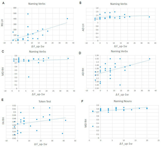 Examples of association between IFOF status and performance at follow-up for naming verbs (A) shows the relation to NS of the LH, (B) shows the relation to AD of the LH, (C) shows the relation to MD of the RH and (D) shows the relation to MD of the RH), Token Test (E) shows the relation to FA of the RH, and Naming nouns (F) shows the relation to MD of the RH.