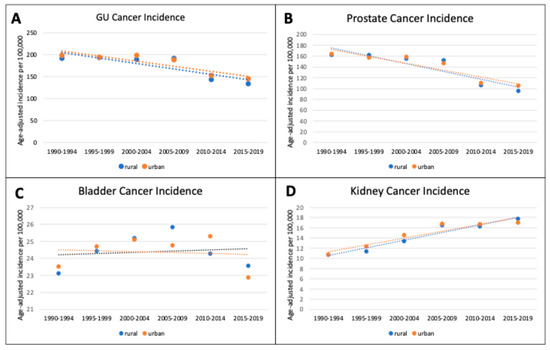 Age-adjusted genitourinary cancer incidence in rural and urban Pennsylvanian counties (1990–2019): (A) Overall genitourinary (GU) cancer incidence; (B) prostate cancer incidence; (C) bladder cancer incidence; (D) kidney cancer incidence. Age-adjusted incidence per 100,000 for each time interval with joinpoint regression line.