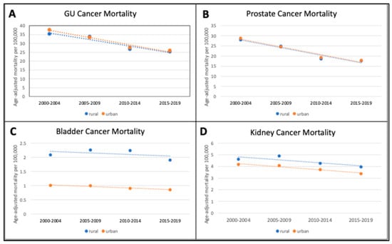 Age-adjusted genitourinary cancer mortality in rural and urban Pennsylvanian counties (1990–2019): (A) Overall genitourinary (GU) cancer mortality; (B) prostate cancer mortality; (C) bladder cancer mortality; (D) kidney cancer mortality. Age-adjusted mortality per 100,000 for each time interval with joinpoint regression line.