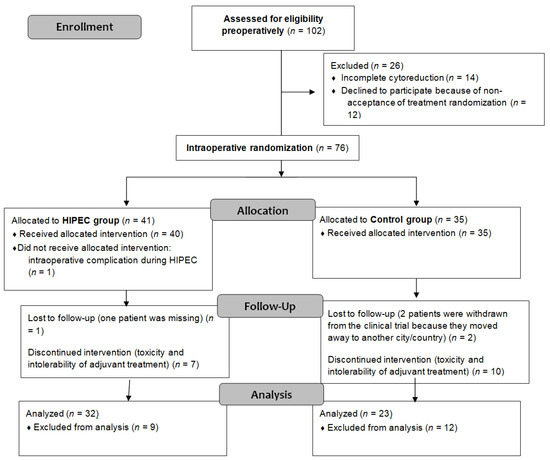 HIPECOVA is a single-center, randomized phase 3 clinical trial conducted in women with peritoneal involvement of primary EOC (International Federation of Gynecology and Obstetrics (FIGO) stages II, III, and IV) [23] or tumor recurrence, in whom complete cytoreduction was achieved. Randomization was performed intraoperatively once complete cytoreduction was successful.