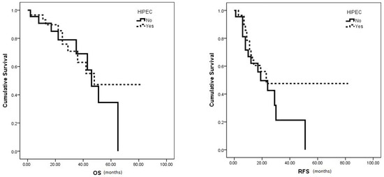 Median OS and RFS survival in HIPEC vs. no HIPEC group.