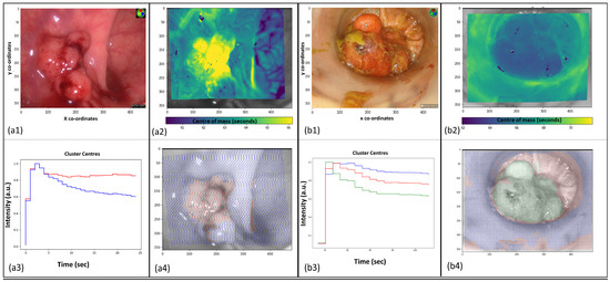 Images showing ‘early’ timepoint malignant and benign rectal lesions with white light imagery and 2D dynamic perfusion profile mapping. The outer grey borders around images represent regions lost during tracking. X and Y co-ordinates are constant across all images. (a1): White light view of a malignant rectal polyp. (a2): Pixel-by-pixel dynamic perfusion curves of malignant rectal polyp represented by a centre of mass heat map demonstrating intra-lesional heterogeneity. (a3): Graph representations of the two clusters (red and blue) created from assessment of time–fluorescence curves. (a4): Resulting heatmap following image creation using unsupervised clustering. Intralesional heterogeneity (red and blue) consistent with malignancy. (b1): White light view of benign rectal polyp. (b2): Pixel-by-pixel dynamic perfusion curves of benign rectal polyp represented by a centre of mass heat map demonstrating intra-lesional homogeneity. (b3): Three cluster centres created from all tracked pixel data. (b4): Clustering was applied to create an image showing intra-lesional homogeneity.