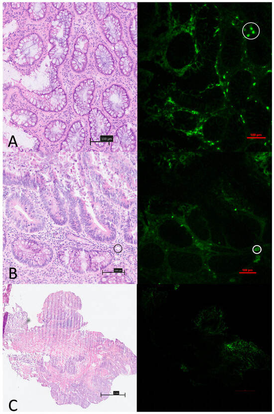 Compound white light and NIR fluorescence microscopy images of ‘early’ phase tissue samples: (A): 10× magnification image of relative stromal fluorescence concentration with minimal uptake seen within the glandular tissue at early timepoints. Concentration within plasma cells marked with white circle (top right). (B): Images taken from a low grade, poorly differentiated adenocarcinoma demonstrating a small volume of tumour with a surrounding predominantly inflammatory component in which ICG is seen to accumulate. (C): Images from a poorly differentiated adenocarcinoma demonstrating early strong uptake within lymphatics and vascular channels (black and white circles) but no relative uptake within abnormal glands.