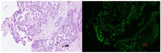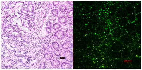 ‘Late’ obtained sample of colorectal adenocarcinoma demonstrating a reversal of appearances seen at the ‘early’ timepoints, with intracellular cytoplasmic uptake of ICG within malignant glands and a relative lack of ICG within the neoplastic stroma.