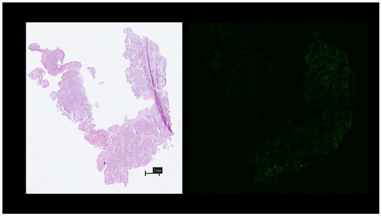 LI–COR slide scanning demonstrated a higher mean fluorescence/area score for cancer versus healthy tissue (4.593 fluorescence intensity units/area vs. 7.267), but the distribution of fluorescence between the two groups did not reach statistical significance with Mann–Whitney U testing (p = 0.436). A Kruskal–Wallis test showed significantly higher fluorescence intensities in the stroma compared with benign and malignant glands at ‘early’ timepoints (p < 0.001). At ‘later’ timepoints there were significant fluorescence intensity differences between malignant and benign glands (<0.001) and benign glands vs. stroma (p = 0.014), but not between malignant glands and stroma (p = 0.297).