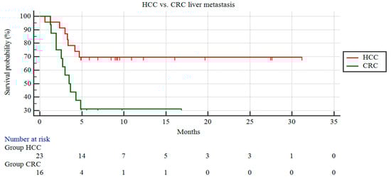 The patients with HCC demonstrated a significantly longer CSS than those with liver metastasis from CRC (22.64 ± 2.7 vs. 7.21 ± 1.65 months; p = 0.014) (Figure 1).