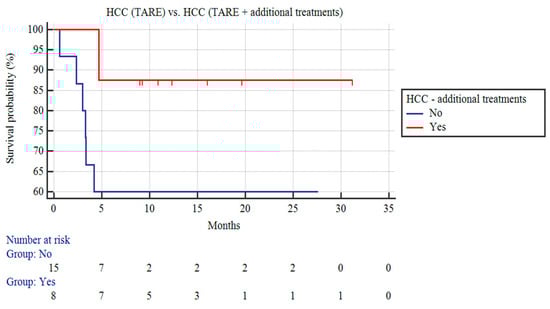Kaplan–Meier curves of patients with HCC undergoing TARE and patients with HCC receiving TARE and additional treatments.