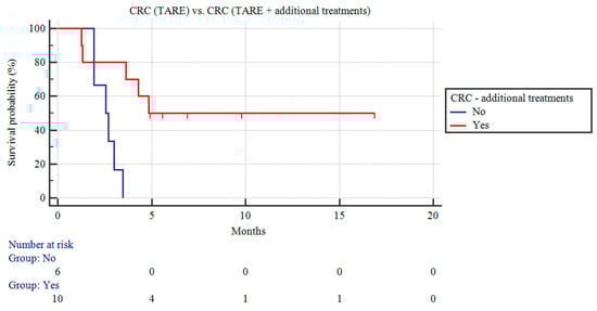 Kaplan–Meier curves of patients with CRC liver metastases undergoing TARE and patients with CRC liver metastases receiving TARE and additional treatments.