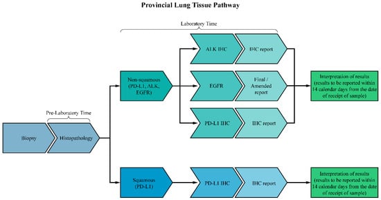 The timely reporting of all core biomarkers is therefore crucial and endorsed by provincial and national guidelines. According to the Ontario Provincial Lung Cancer Tissue Pathway Map [], biomarker results should be reported within 14 calendar days of receiving a sample at a molecular reference laboratory. Similarly, the College of American Pathologists guidelines on biomarker testing established a benchmark of 10 working days to report biomarker results after sample receipt [,].