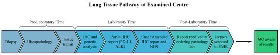 Time was measured in calendar days at each part of the tissue pathway (Figure 2). Total TAT was defined as the time in calendar days from histopathology to the final molecular report available in the EMR []. Total TAT was reported separately by histology. To calculate the pre-laboratory time, the number of days was measured between the date of histopathology and the sample arriving at the molecular reference laboratory (MRL). If there was insufficient tissue for testing, pre-laboratory time was measured from the first sufficient histopathology to tissue arrival at MRL. Laboratory time was measured as the time from receiving the sample at the MRL to the time that the pathologist at the MRL issued a final report. Post-laboratory time was measured as the time from the partial and/or final report MRL sign-off to the report being available locally in the EMR. IHC/NGS results that were not available in the EMR at the time of the retrospective chart review were omitted from the determination of total TAT analysis. Data were also collected on the number of patients receiving empiric treatment without full molecular results, the prescription of radiation while awaiting results, the number of patients with and without results at the time of referral and consult, and the number of patients who were hospitalized or died before an optimal (systemic) treatment decision was made.